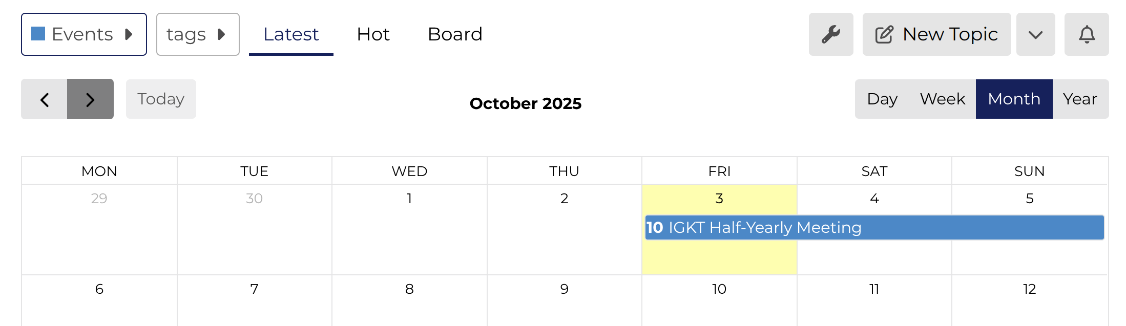 The forum can then use the Title, Start date/time and End date/time to display these events in a visual Calendar which is visible at the top of the Events category: