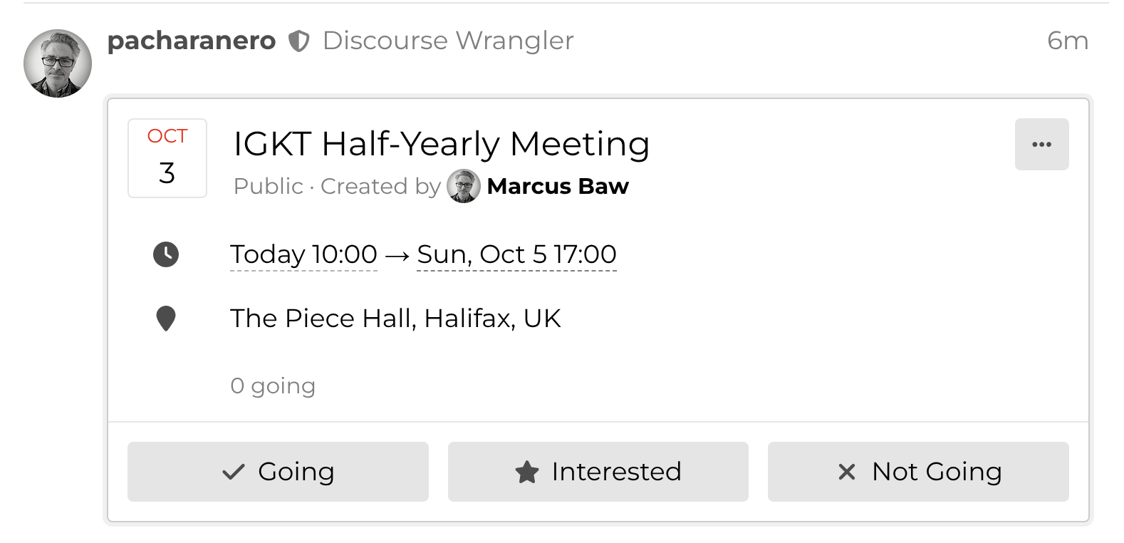 To create an event, start a new Topic, and use the ‘plus’ icon in the composer toolbar to get the Options menu. In the Options menu select ‘Create event’ and fill in any of the fields that are relevant to your event. The main ones are of course Start date/time and End date/time. If it’s a physical meeting then Location is useful. If it’s an online event then you can put the joining link in the Event post.