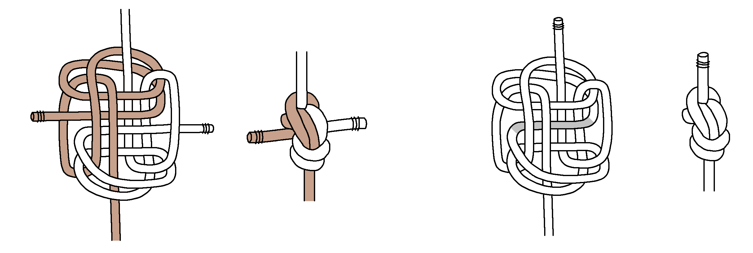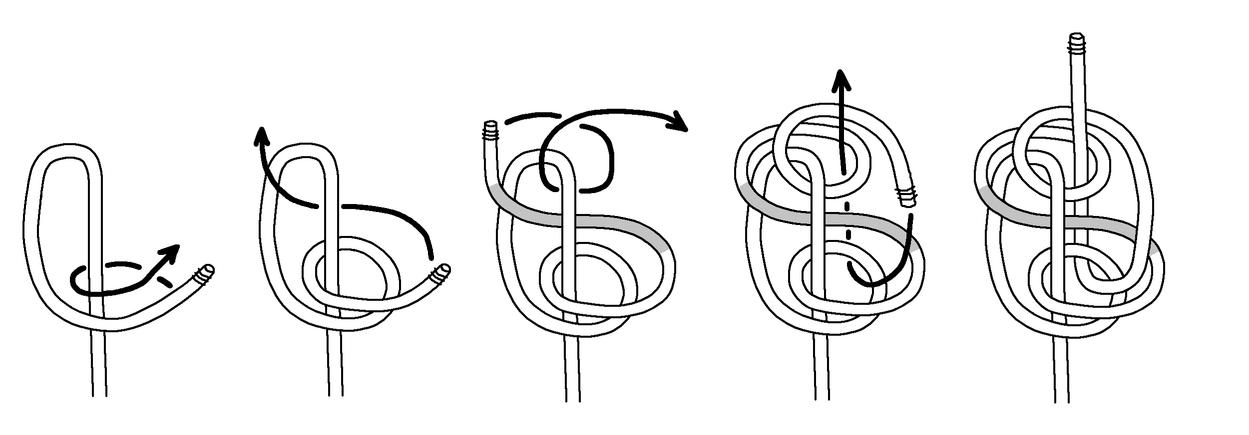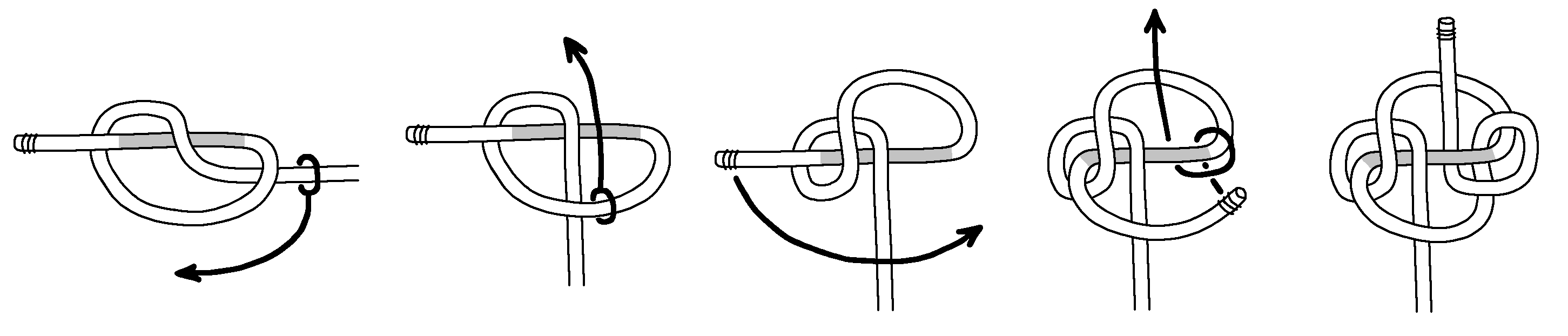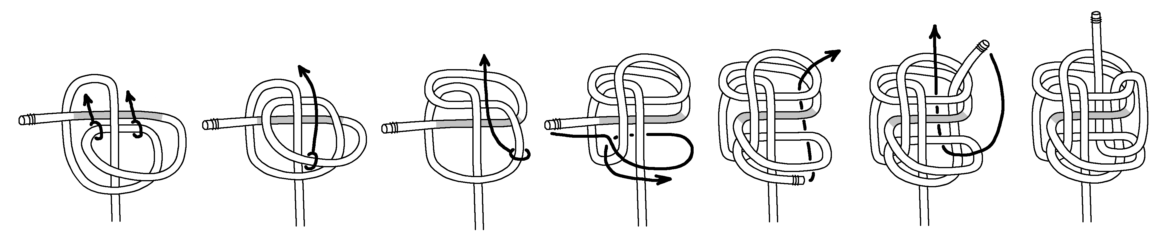 Next, here are tying instructions for a Double Blimp Knot A2. Again, we find tightening is even more difficult. Keeping the horizontal part centered (shaded grey) is important, and you gradually tighten the top and bottom.