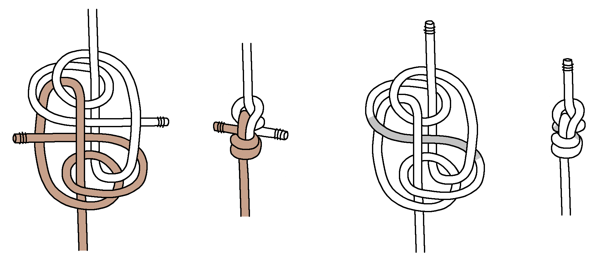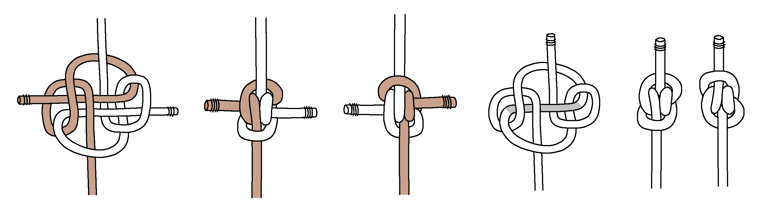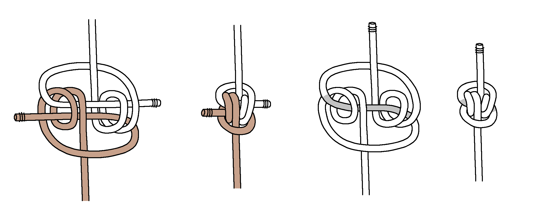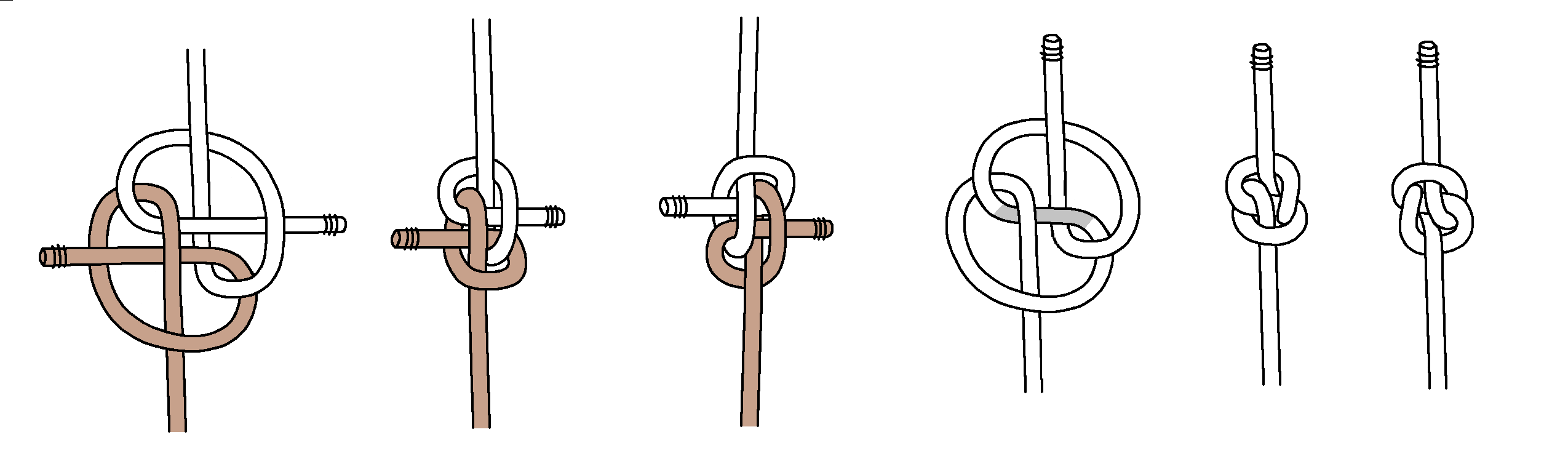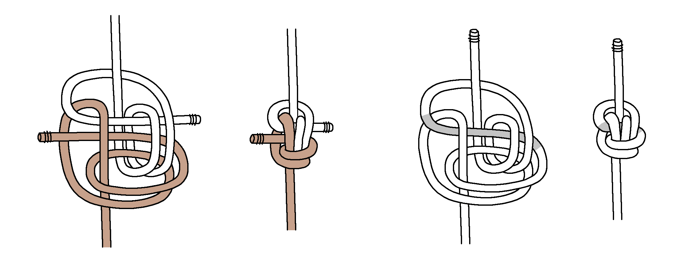 Next, here are tying instructions for a Double Blimp Knot A2. Again, we find tightening is even more difficult. Keeping the horizontal part centered (shaded grey) is important, and you gradually tighten the top and bottom.