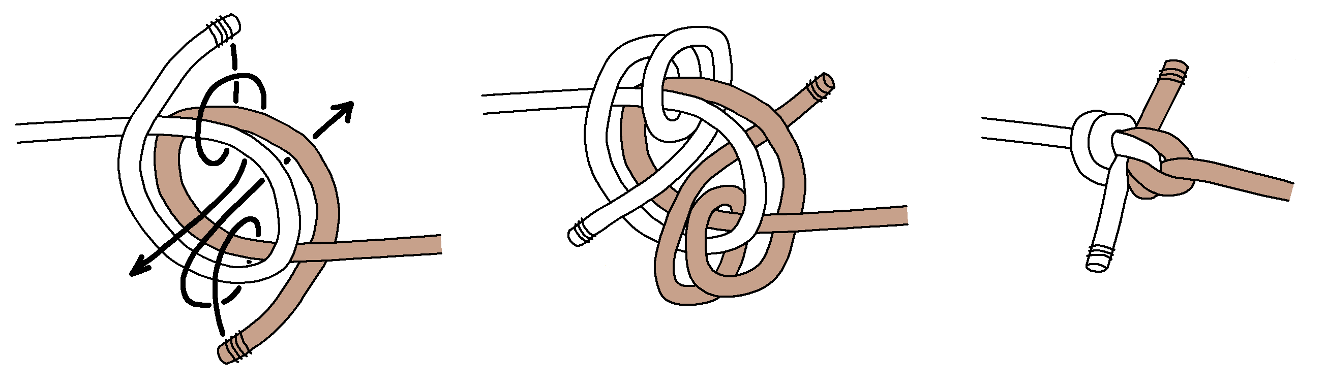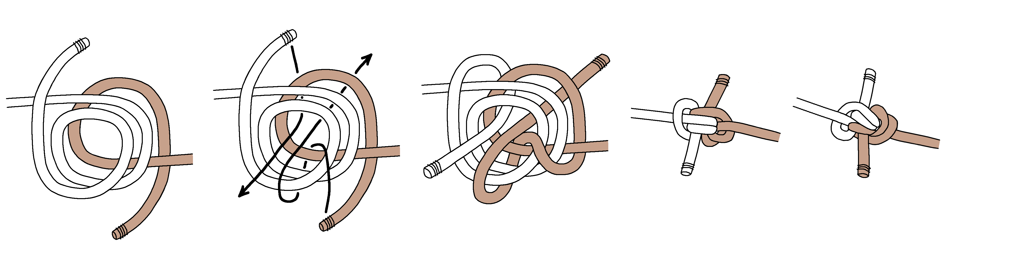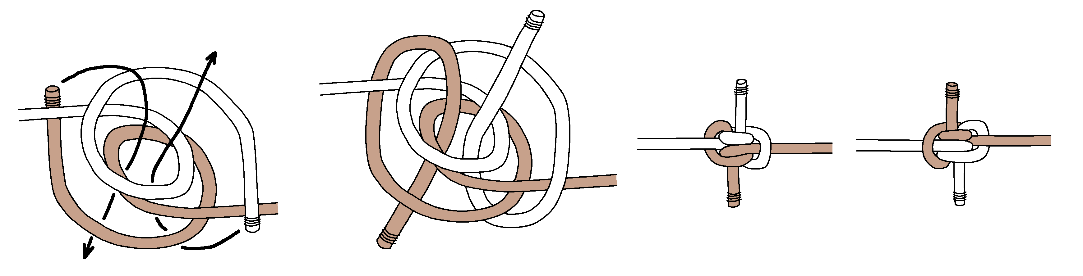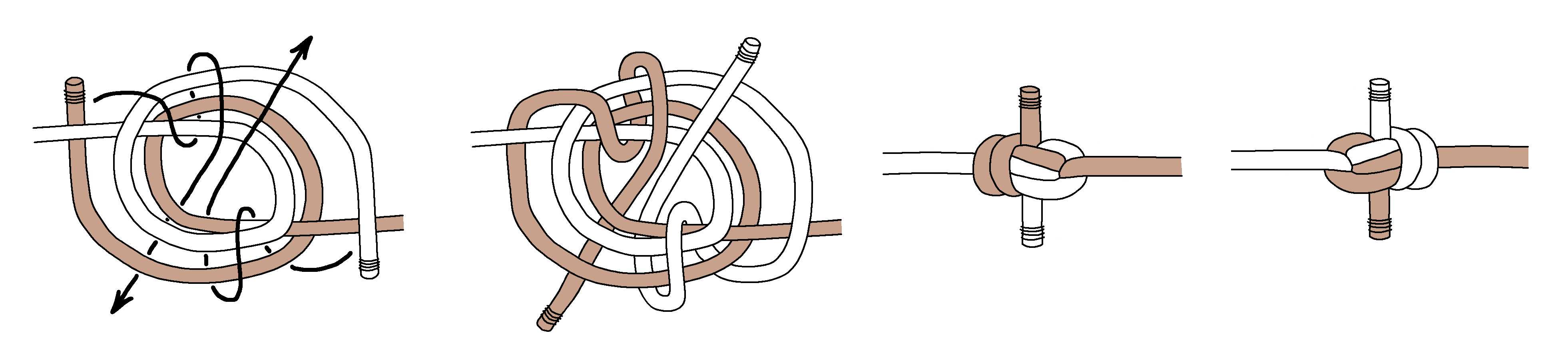 Next, here are tying instructions for a Double Blimp Knot A2. Again, we find tightening is even more difficult. Keeping the horizontal part centered (shaded grey) is important, and you gradually tighten the top and bottom.
