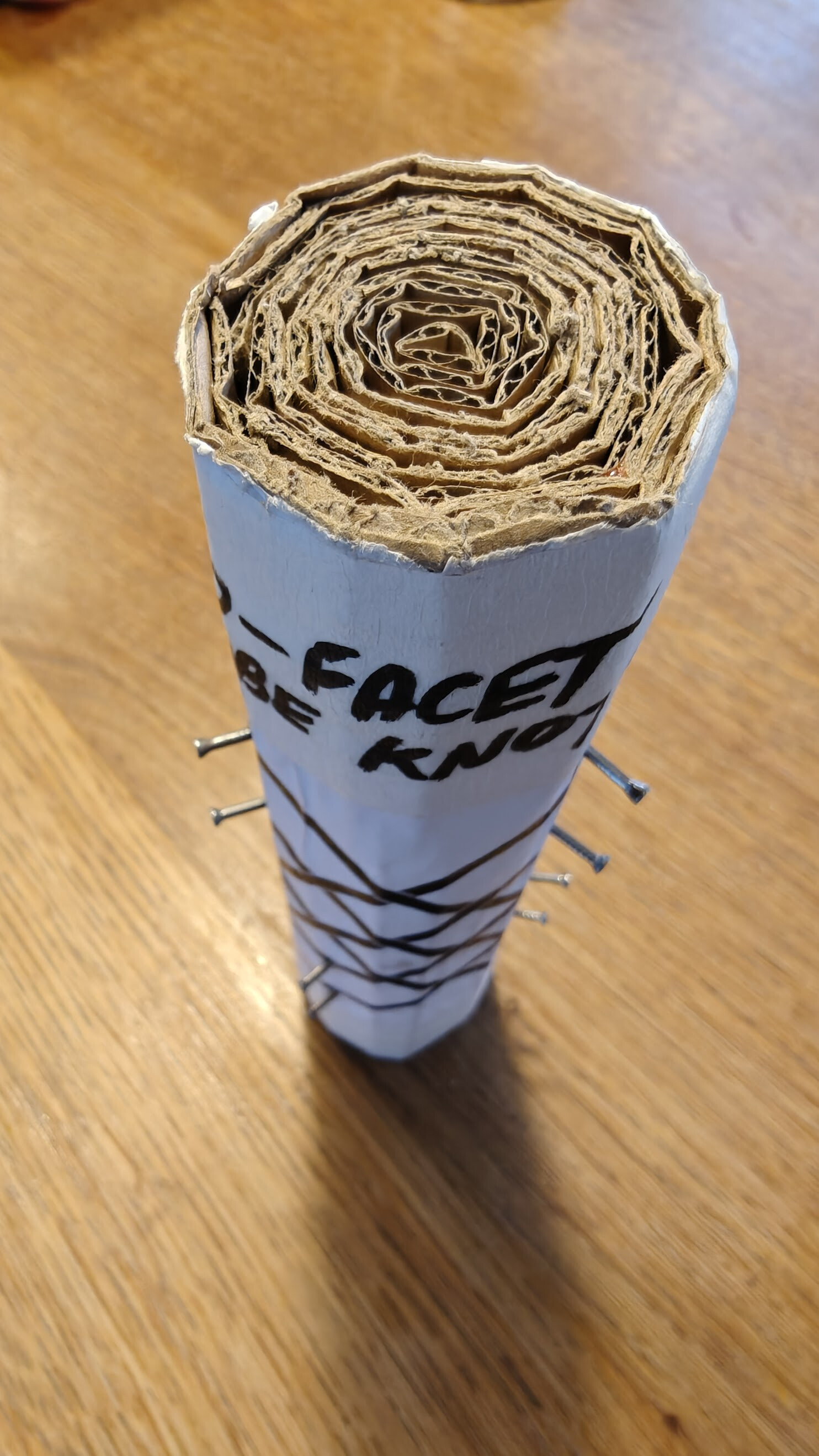 After one completed pass, once the cord is back to the start again, gently unhook the bights from the nails and remove from the mandrel.