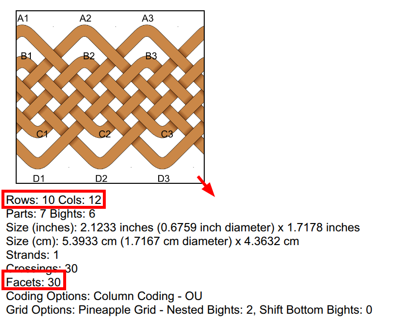 In short, you use the ‘Pineapple Grid’ button with 2 Nested Bights, then drag to resize the grid until it is 10 rows and 12 columns. It will tell you below the number of crossings/facets - so you can create anything you want.