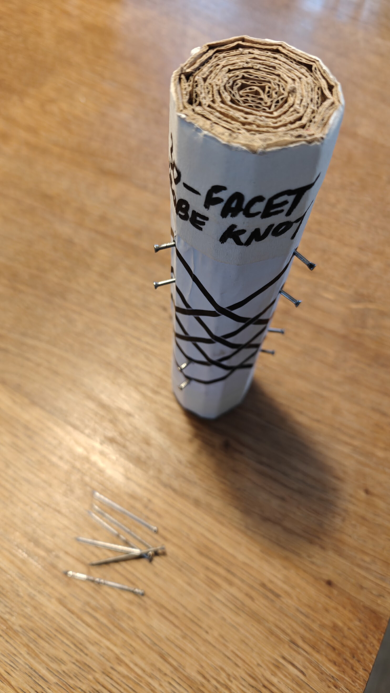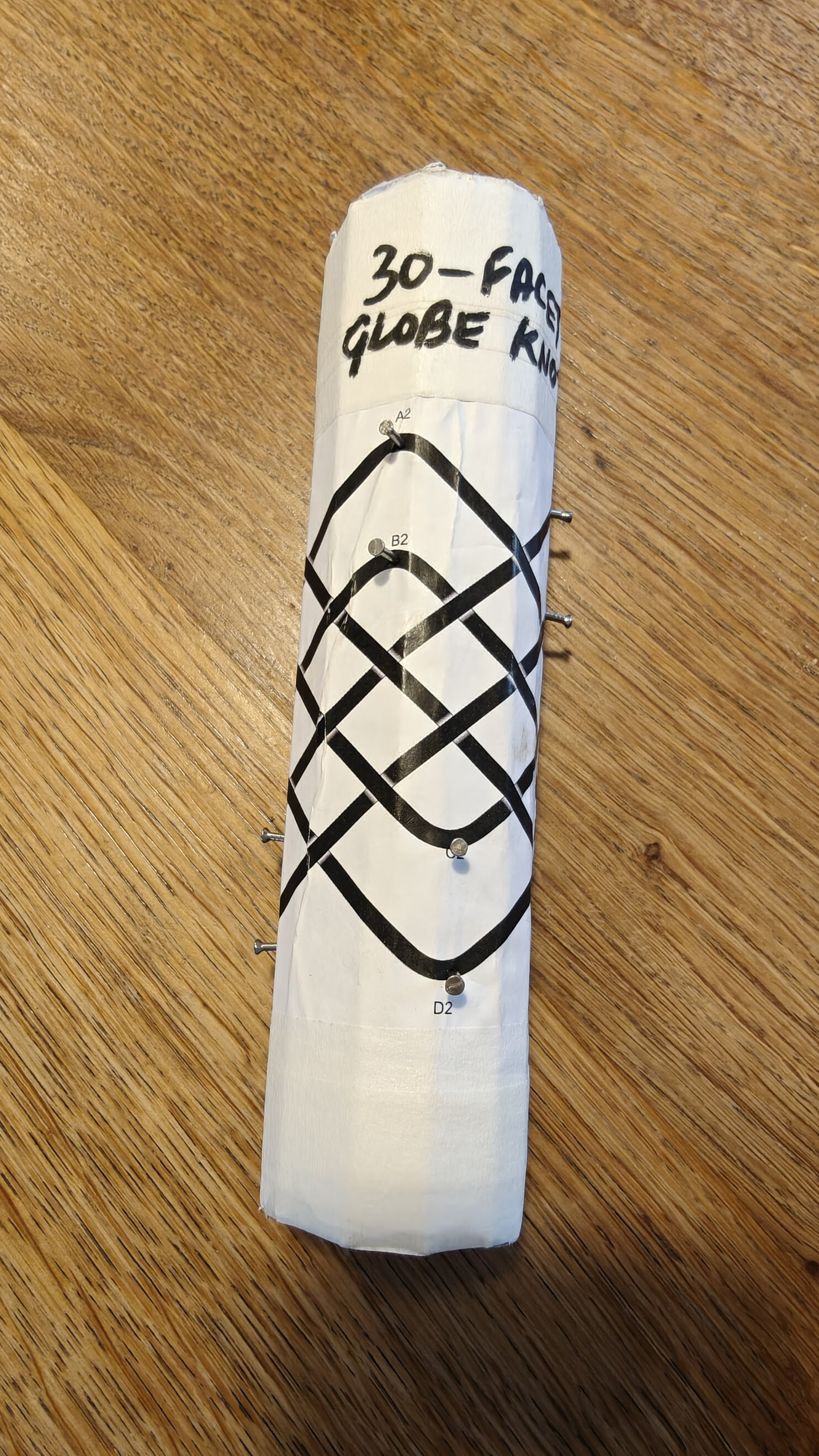 I measured the final diameter and used the Allwine Designs web calculator to print the pattern at exactly that size. The pattern is glued on to the mandrel and nails or pins inserted at the points where the cord needs to be hooked to create a bight.
