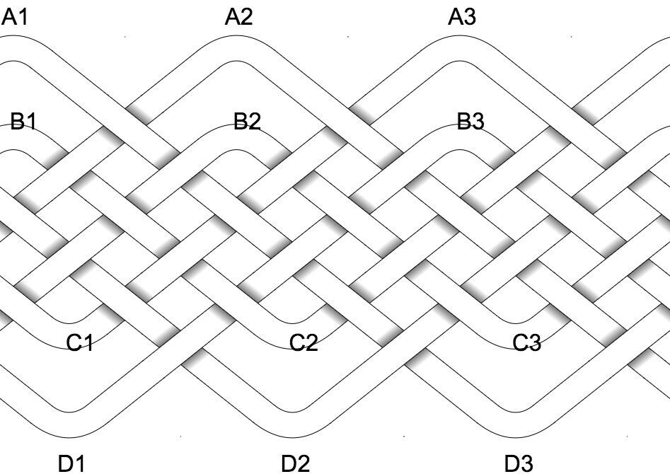 Start anywhere on the mandrel (say C1 or B3… - it doesn’t matter really, but I would advise not the A or D bights), by placing part of the standing end of the cord on the mandrel about where you measured that you would need for the first pass, and working with the free/working end.