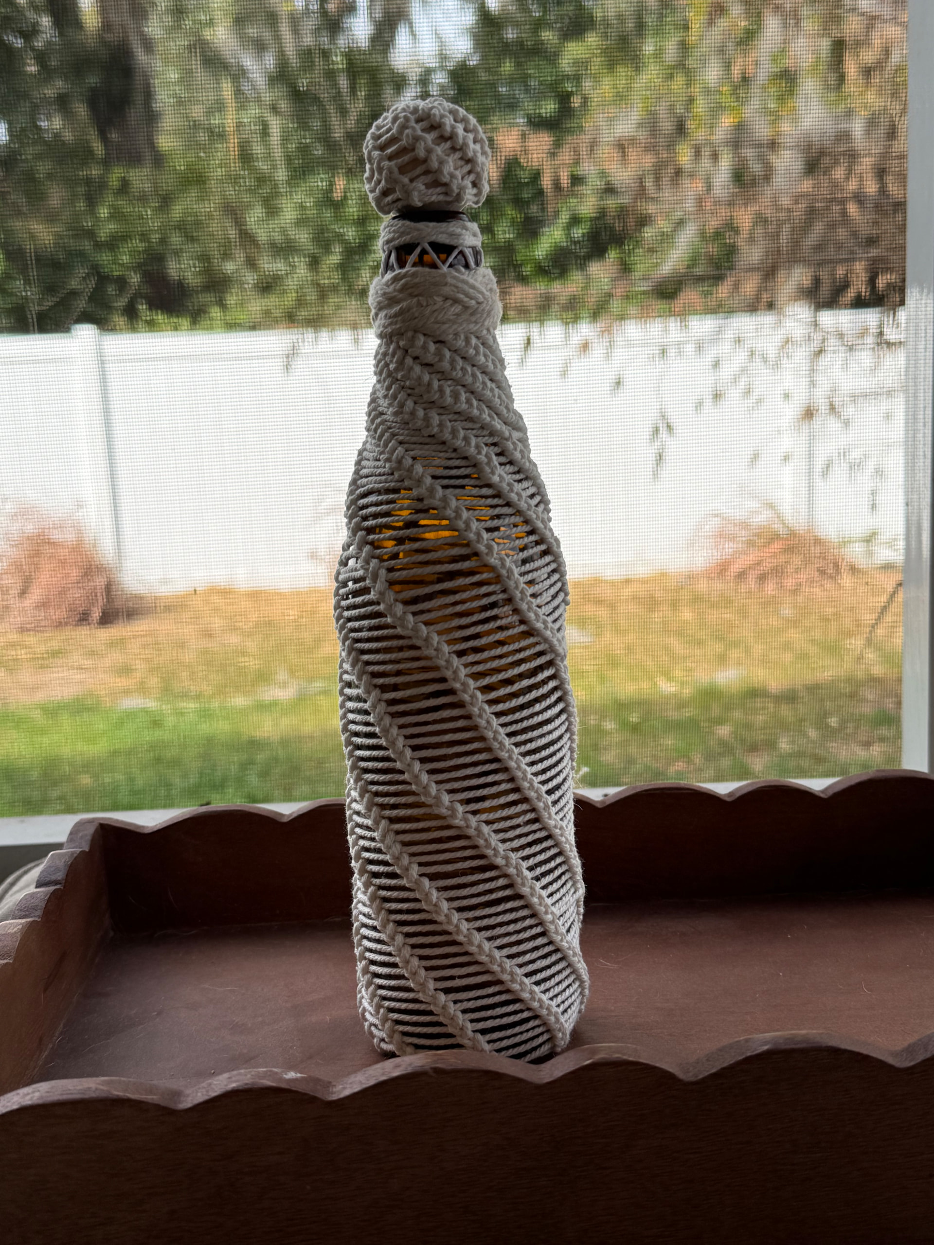 Hello, I’m new to the guild and to knot tying. The attached photo is my first attempt at covering a bottle. I followed a couple videos I found on YouTube including one from Zenropeworks to learn how to do the hitching. I’d like to add a pointy element to finish off the wood bead topper to make it look more like a finial, but I’m unsure what to do. A star knot with some kind of pointy center? I would love any suggestions or help with instructions. Thanks!
