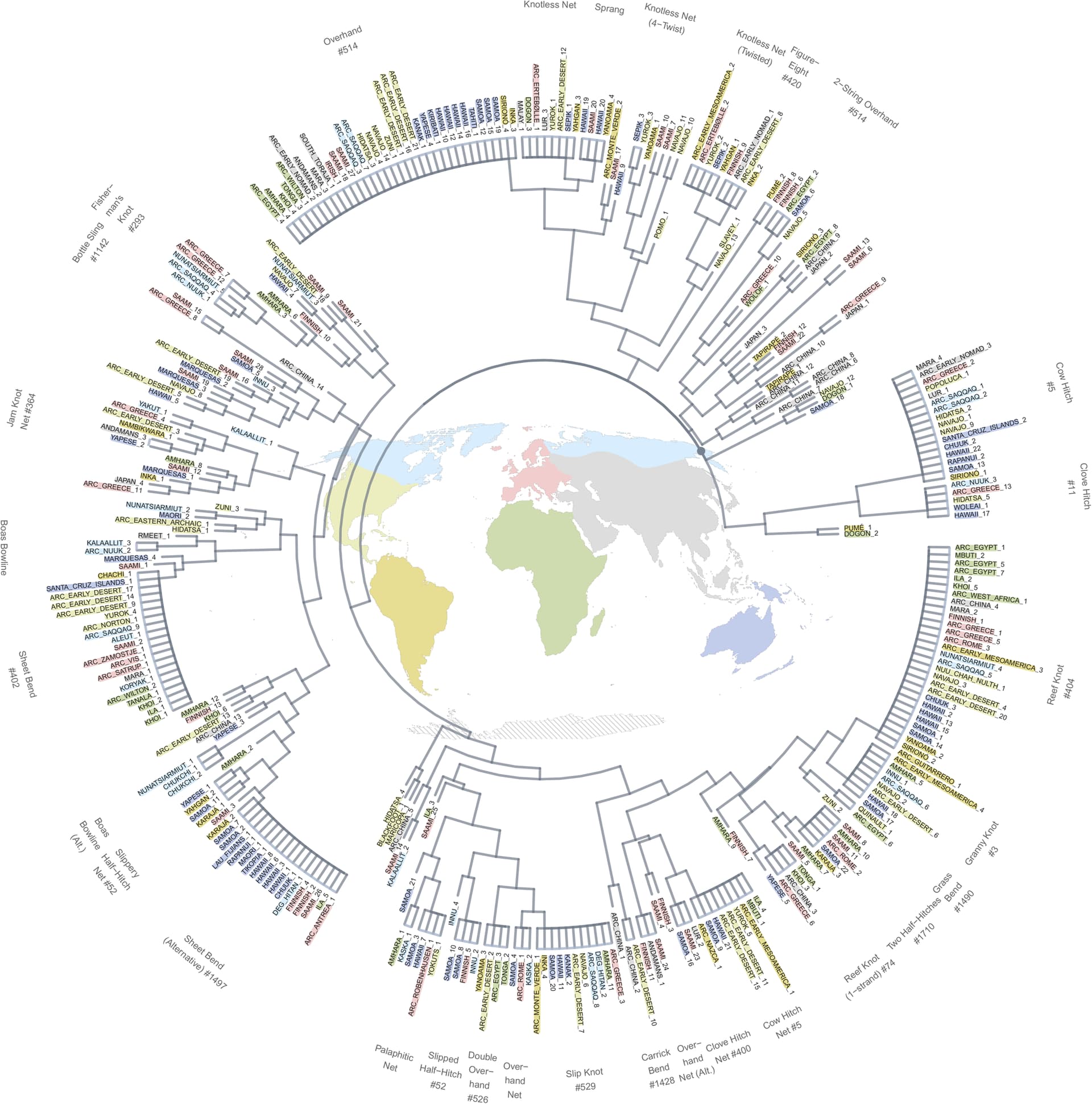 Overall, “The most commonly recurring knots across cultures are the sheet bend (clusters #402 and #1497; documented in 29 cultures), overhand knot (#514; 24 cultures), reef knot (#75 and #74; 23 cultures) and cow hitch (clusters #5; 20 cultures).