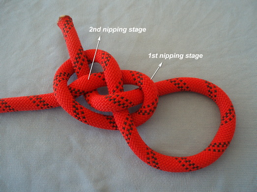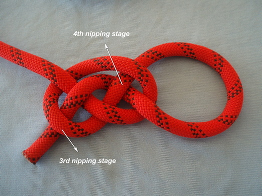 The first phase of this process is to create the Dines knot. If someone examines the Dines from both sides, he/she will notice the four nipping stages (two from the SPart and two from the outgoing eye leg) of the tug end, as shown in the first two images.