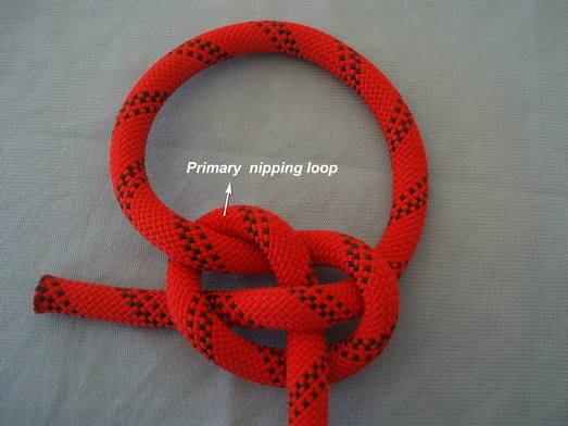 In the second (cask) method, the direct SPart continuation, is designated as the primary nipping loop (of the nipping structure), which clamps both collar legs (bowline rule), as shown in second image.