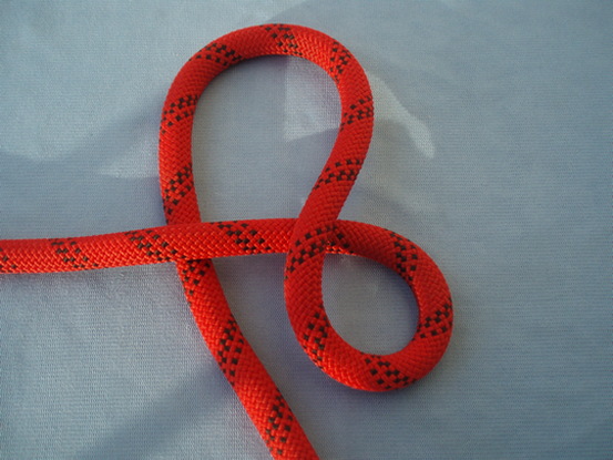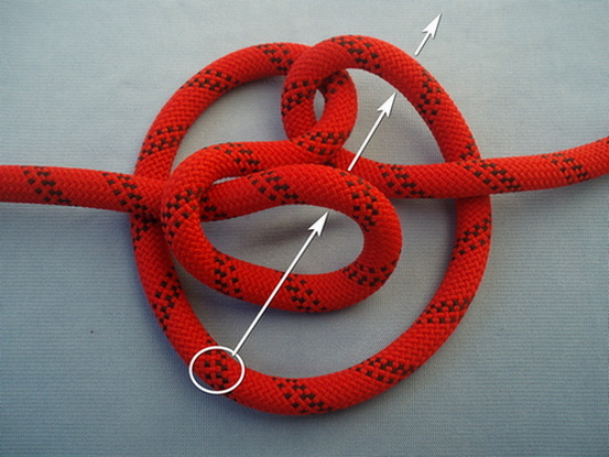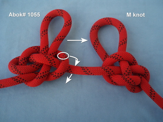 For example, at the left knot (Abok#1055), the nipping loop is a direct continuation of the right SP, with one rope diameter passing through, while at the right knot (M knot), the nipping loop is a direct continuation of the left SP with two rope diameters passing through.